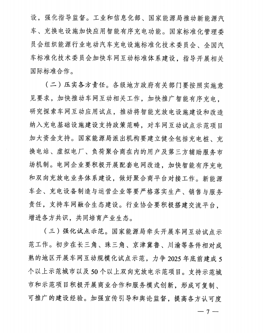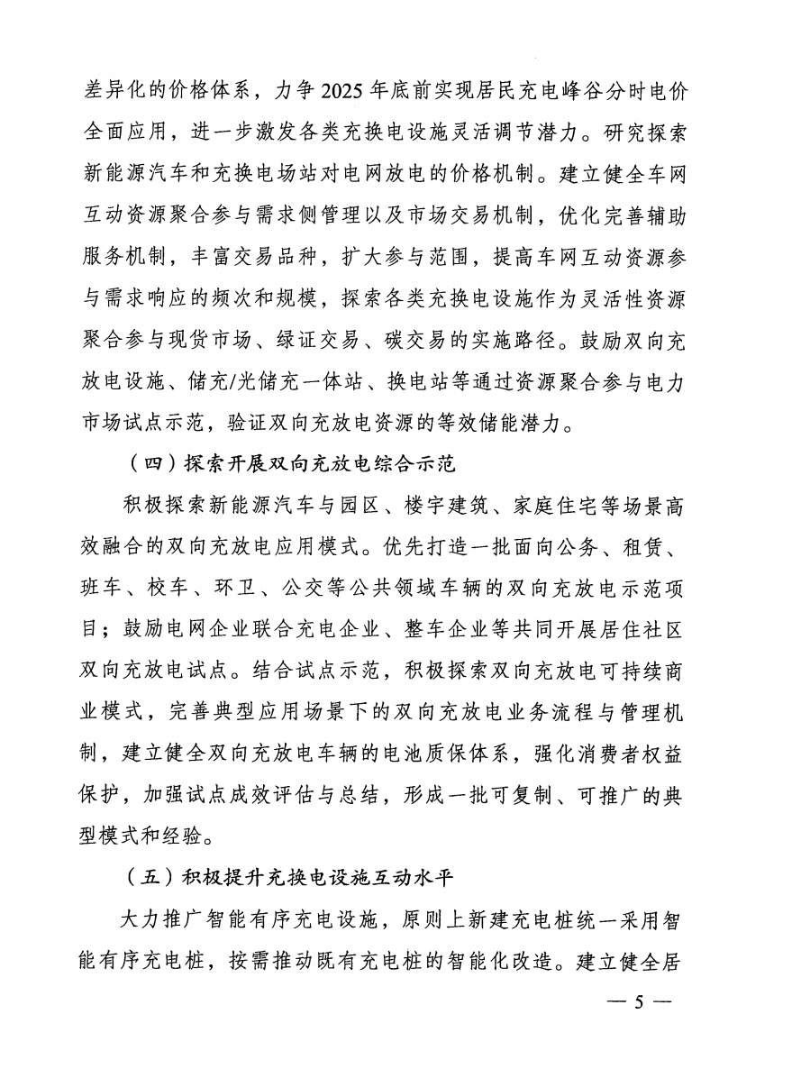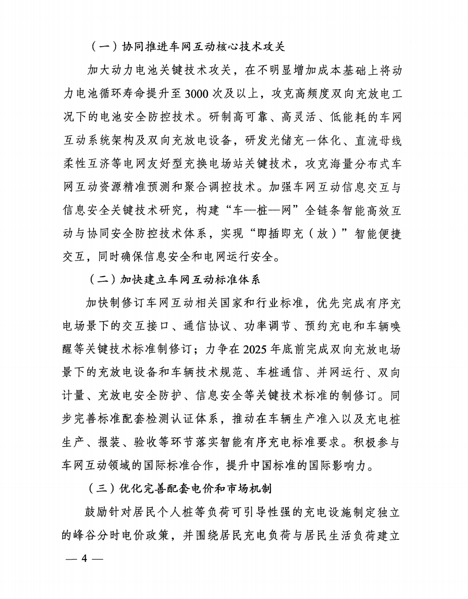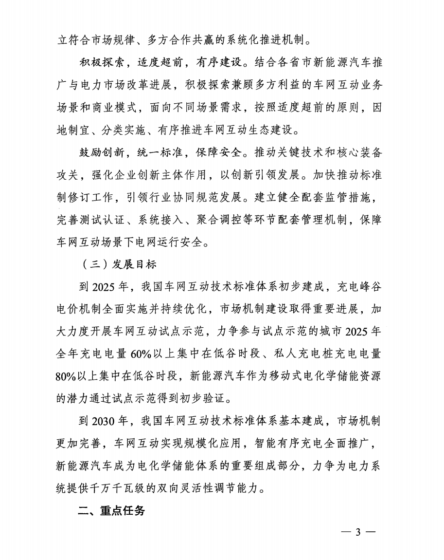文件指出,到 2025年,我国车网互动技术标准体系初步建成,充电峰谷电价机制全面实施并持续优化,市场机制建设取得重要进展,加大力度开展车网互动试点示范,力争参与试点示范的城市2025年全年充电电量60%以上集中在低谷时段、私人充电桩充电电量80%以上集中在低谷时段,新能源汽车作为移动式电化学储能资源的潜力通过试点示范得到初步验证。到2030年,我国车网互动技术标准体系基本建成,市场机制更加完善,车网互动实现规模化应用,智能有序充电全面推广新能源汽车成为电化学储能体系的重要组成部分,力争为电力系统提供千万千瓦级的双向灵活性调节能力。